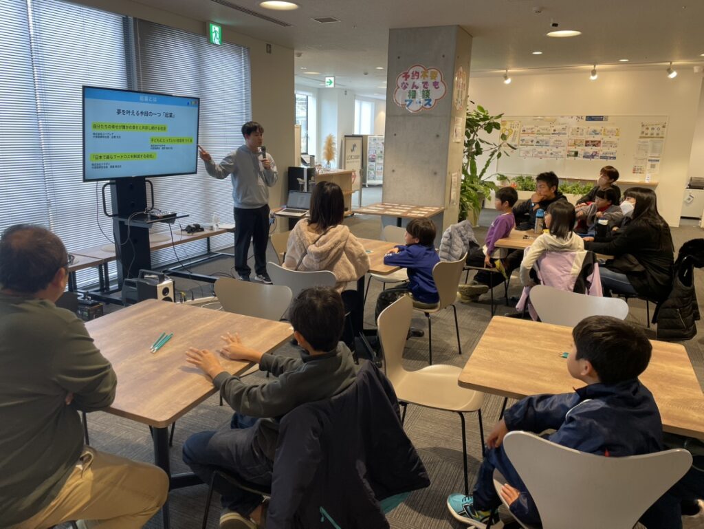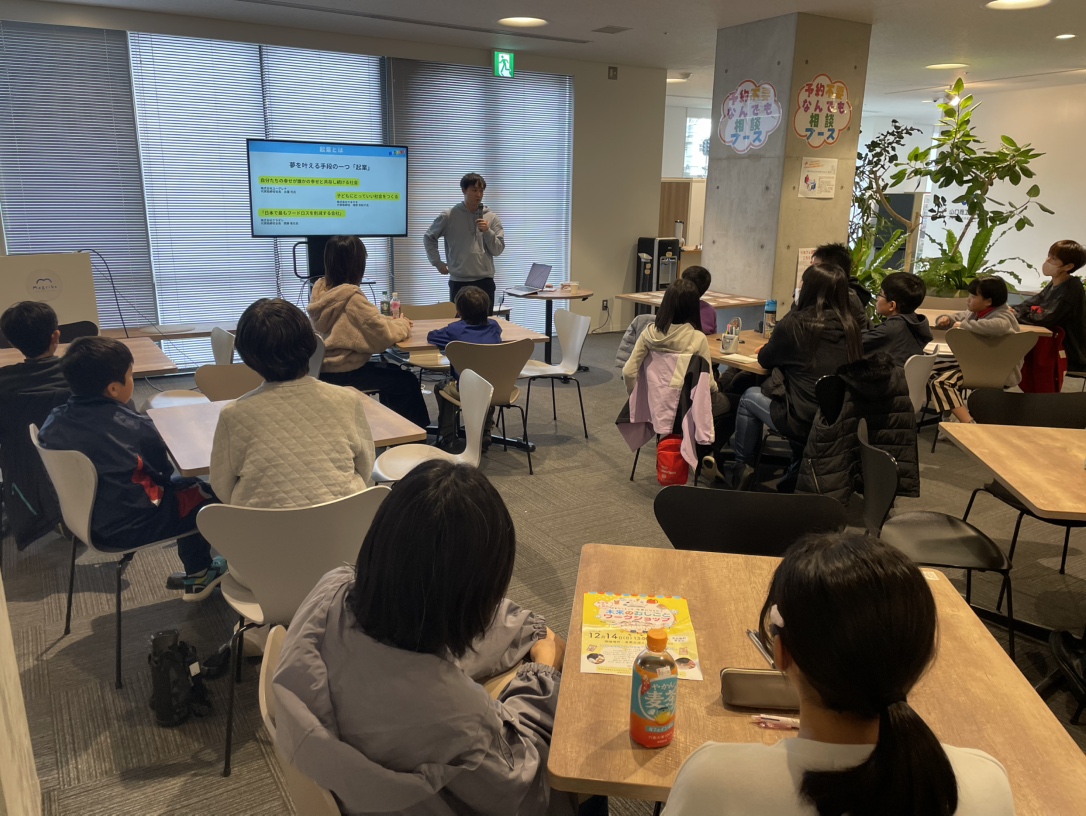 「好きなことを仕事にできるの?」をテーマに、自分の「好き」を知り、その好きとアイデアを組み合わせて将来の仕事について考えるイベントを開催しました。講師には、東京から株式会社ミライクルラボ代表取締役社長の渡邉氏をお招きし、小学生から大学生まで幅広い世代にアントレプレナーシップ教育を提供してきた経験を活かしたワークショップを実施しました。内容は、自分の好きや得意を知るワークと、好きや興味のあることとゲームを掛け合わせてアイデアを生み出すワークの二本立てで構成されました。