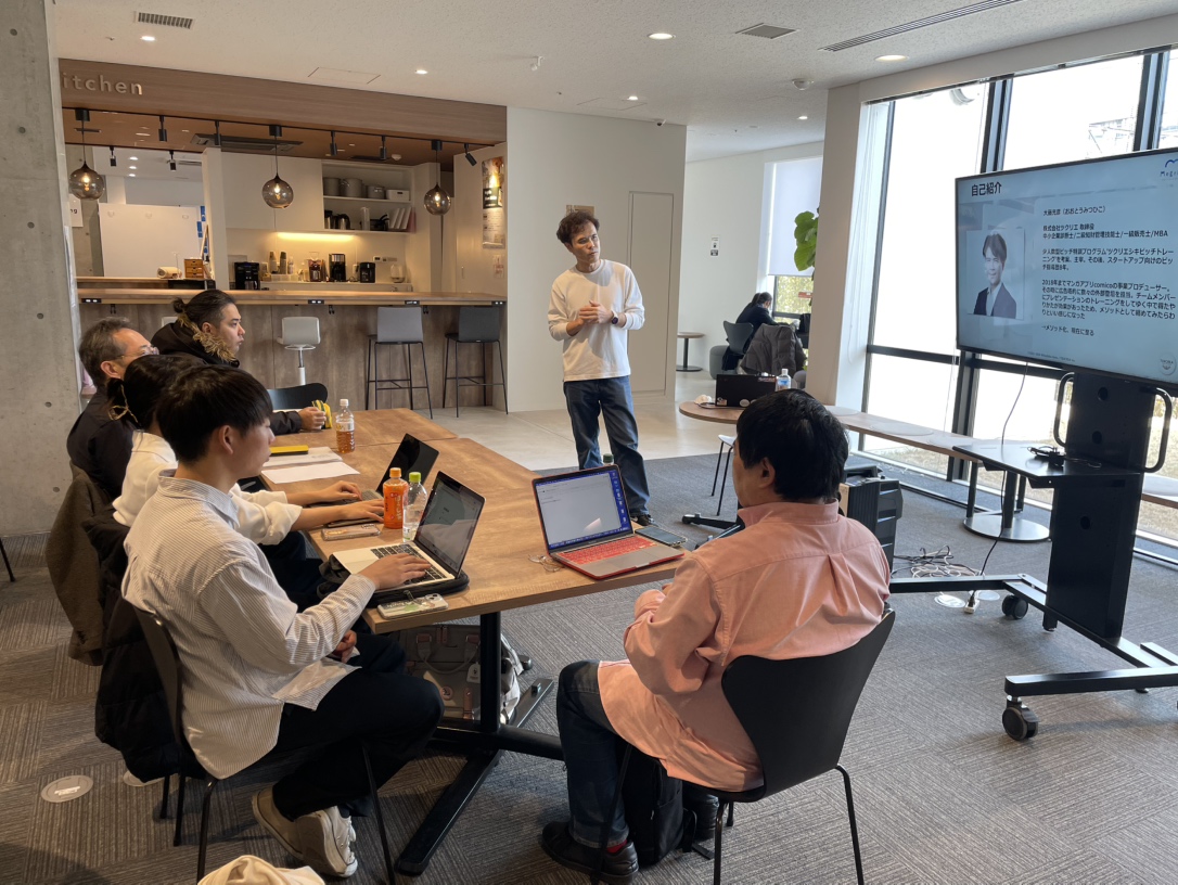 勉強会の前半では、大藤がピッチに必要となる基礎知識や、短い時間で自分の事業を伝えるためのポイントを講義形式で共有しました。