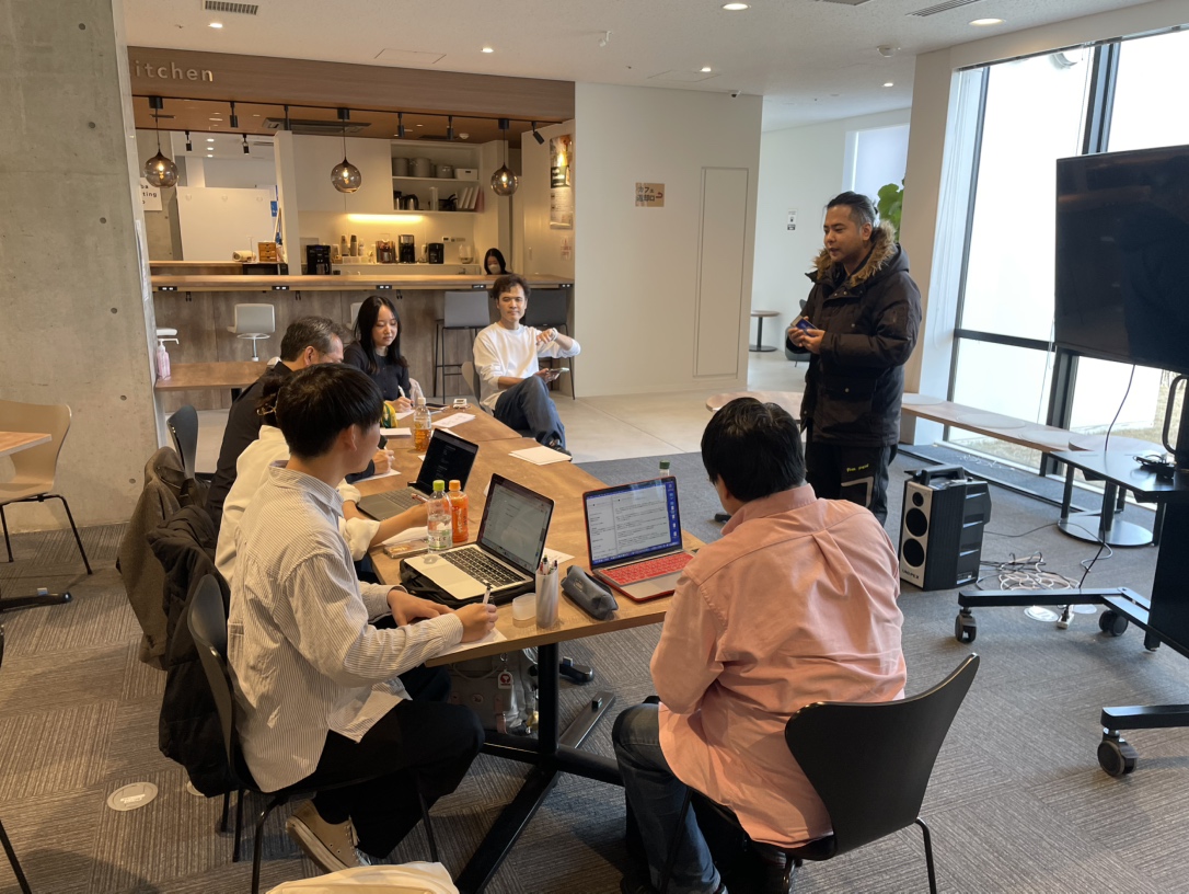 全員のピッチが終わったあとは、お互いの内容について「何が伝わりづらかったか」「どこが良かったか」を率直に共有するフィードバック時間へ。年齢もバックグラウンドも異なるメンバー同士が、立場を越えて意見を交わすことで、気づきや発見が一気に広がりました。「確かにこの説明はわかりやすかった」「ここはもっとシンプルにできそう」といった声が自然と出てきて、聞く側・話す側の双方が成長につながる非常に濃い時間となりました。