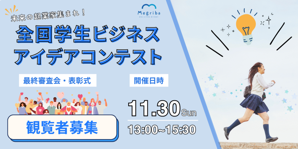 このコンテストは、全国の新規性のあるビジネスを展開したい、もしくは新たなビジネスアイデアを持つ学生をコンテストの形態で広く募集し、産業交流スペースMegribaで支援を行い、将来の新規事業創出、また育成につなげるものです。