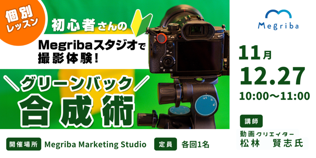 Megriba Marketing Studioにあるグリーンバックを使って撮影から、背景の合成(ワイプ)までを実際に体験できるレッスンです。