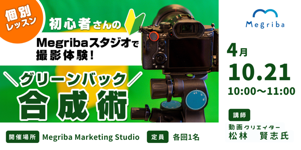 Megriba Marketing Studioにあるグリーンバックを使って撮影から、背景の合成(ワイプ)までを実際に体験できるレッスンです。