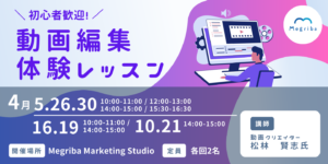 | その他 | イベントの様子をSNSに掲載させていただきます。予めご了承下さい。 ※動画編集体験レッスンの内容以外の質問は受けかねます。ご了承ください。 |