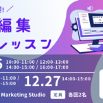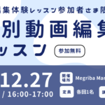 2025.11.27 / 最終更新日 : 2025.10.20 イベント共有 イベント&相談会 【2025年11月】【動画編集体験レッスン受講者限定】個別動画編集レッスン 「初心者歓迎!動画編集体験レッスン」受講者限定で、マンツーマンでの復習レッスンを開催します。 本レッスンは以前に受講頂いた体験レッスンので学んだ4つの内容(①編集画面の使い方、②図形の挿入の仕方、③文字の挿入の仕方、④ア […]