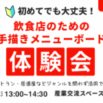 2025.11.04 / 最終更新日 : 2025.10.07 イベント共有 イベント 初めてでも大丈夫!飲食店のための手描きメニューボード体験会~カフェ・レストラン・居酒屋などジャンルを問わず活用できるレッスン~ 手描きの力で、お客様の心に届くメニューを 【 初心者歓迎 】初めてでも大丈夫!飲食店のための手描きメニューボード体験会~カフェ・レストラン・居酒屋などジャンルを問わず活用できるレッスン~ 「手描きのメニューって、なんだか […]