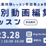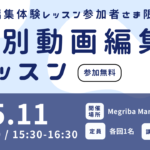 2026.02.11 / 最終更新日 : 2026.01.19 イベント共有 イベント&相談会 【2026年2月】【動画編集体験レッスン受講者限定】個別動画編集レッスン 「初心者歓迎!動画編集体験レッスン」受講者限定で、マンツーマンでの復習レッスンを開催します。 本レッスンは以前に受講頂いた体験レッスンので学んだ4つの内容(①編集画面の使い方、②図形の挿入の仕方、③文字の挿入の仕方、④ア […]