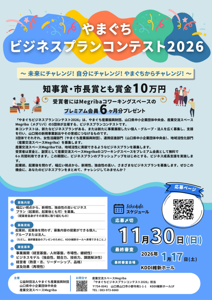 事務局 | 産業交流スペース Megriba (やまぐちビジネスプランコンテスト2026」担当) 〒754-0041 山口県山口市小郡令和1-1-1 KDDI維新ホール1F お問合せはこちら |