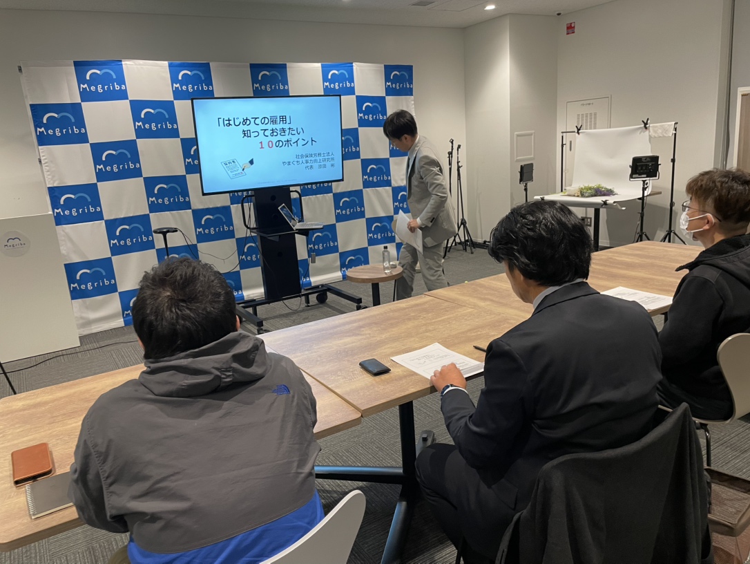 今回は、やまぐち人事力向上研究所の代表であり社会保険労務士の原田彬様を講師にお迎えし、“最初の採用”に必要な実務と注意点について詳しくご説明いただきました。